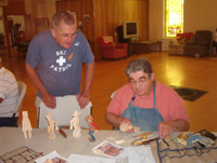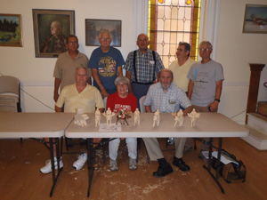 the world from Australia just to attend our August Class and Show. After handing out the cutouts, we quickly got to work removing excess material and blocking in the basic features. By the end of the first day we had made enough progress that Dave handed out practice blocks so we could learn to work on the procedure for carving faces. By day two, we had made so much progress we set aside the cowboy and carved a Christmas Gnome, practicing carving faces again. After lunch we went back to carve the cowboy face and hat, and adding more details to the figure. By the third day out came the paints. Dave demonstrated his painting technique on the gnome first and then as we finished the cowboy, we started painting the cowboy. By the end of class most had finished both carvings. The Senior Center provided an excellent location for the class. As we were sharing the space, other activities were also going on at the Center. One day there were local musicians, and another a dance class, which Ingrid quickly joined in to learn a few more steps. Once again we had a great August, thanks to Dave offering to share his experience with the Club. Next year? If you have ideas give Wood a call. |