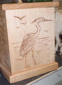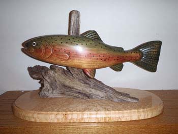 We labeled our August 1013 class "Fish & Chips". Participants worked on carving two subjects, a Stylized rainbow trout in either pine or butternut with Bob Lindemann and a chance to try your hand at chip carving a blue heron pattern with Dave Tuttle. 8 members participated in the class, by thursday afternoon most all of the trouts were ready for paint, so while the paint dried, Dave lead the group on an introduction to Chip Carving. We kept looking over our shoulders on friday as the fish were finished and we realized we were over out daily limit, and hoped the Game Warden didn't show up...
