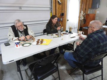 | April showers and an early week snow helped bring early spring weather for our trip to Walpole for our April CarveIn The northern group was down to just Matt and myself, and as we arrived, Dave was starting the heater to warm up the garage and had some "shelf elf" style Santa cutouts for the day's project. Others soon arrived and we were up to 9 carvers. As always the snack table was stocked with coffee, kuchen, scones and cookies to hold us over till lunch. While many worked on the shelf elf Santas, Dustin and Oliver again focused on spoon carvings. A few time during the morning, Dave made a trip to the basement to help touchup some of our dull tools, while lots of chips filled the floor throughout the conversations during the morning . We covered everything from the summer class, the Lunar flight the night before and the arrival of tick season. Back to carving we worked till around noon Bowls of Corn Chowder and bread arrived. During lunch, Dale, "the Carvin' Barber" arrived and showed us the same Santa he had carved during the week with Dave as well as photos of the chainsaw carving he has been working on. We called it a day at 2:00 and did a few of us did a short side trip to Barb's to help start sorting thru Wood's wood collection in the attic, including a few carvings we can finish and put on the fundraising table at the August Show.. Once again thank you Dave for a great day of carving and excellent corn chowder. | ![]() |