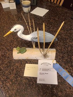 a bit of "homework". Wednesday the Senior Center had a morning event planned so we had live music, as Matt Strong handed out the blanks for a stylized American Bitter in Butternut. We began with carving "grass" for the base. Carved very thin, the pine pieces were placed in water to soften till lunch so they could be bent into shape. The body blank required a lot of wood removal to get the basic form so by lunch the floor was covered with quite a large pile of wood chips. Matt carved his own piece so we could see how each part of the finished piece evolved. Again by the end of the day, the carvings were taking shape. Thursday, Dave Tuttle lead us through the process of carving a shore bird. The basswood was a bit easier to carve, the grain cooperated, and by lunch the birds were finished and ready for paint. After another excellent lunch provided by Meals on Wheels, Dave pulled out the paints and brushes and demonstrated which colors to mix and techniques to do the basic colors and add the feather details. By clean up time, most of the shore birds were completed by the end of our last day. Our homework assignment the last day was to bring all 3 birds to the show Saturday for the "Class" table. Some arrived as "works in progress", while some "burned the midnight oil", to get all 3 birds finished. Once again we had a very successful class, thanks to all of the advance planning, organizing and the talents of our three instructors. |